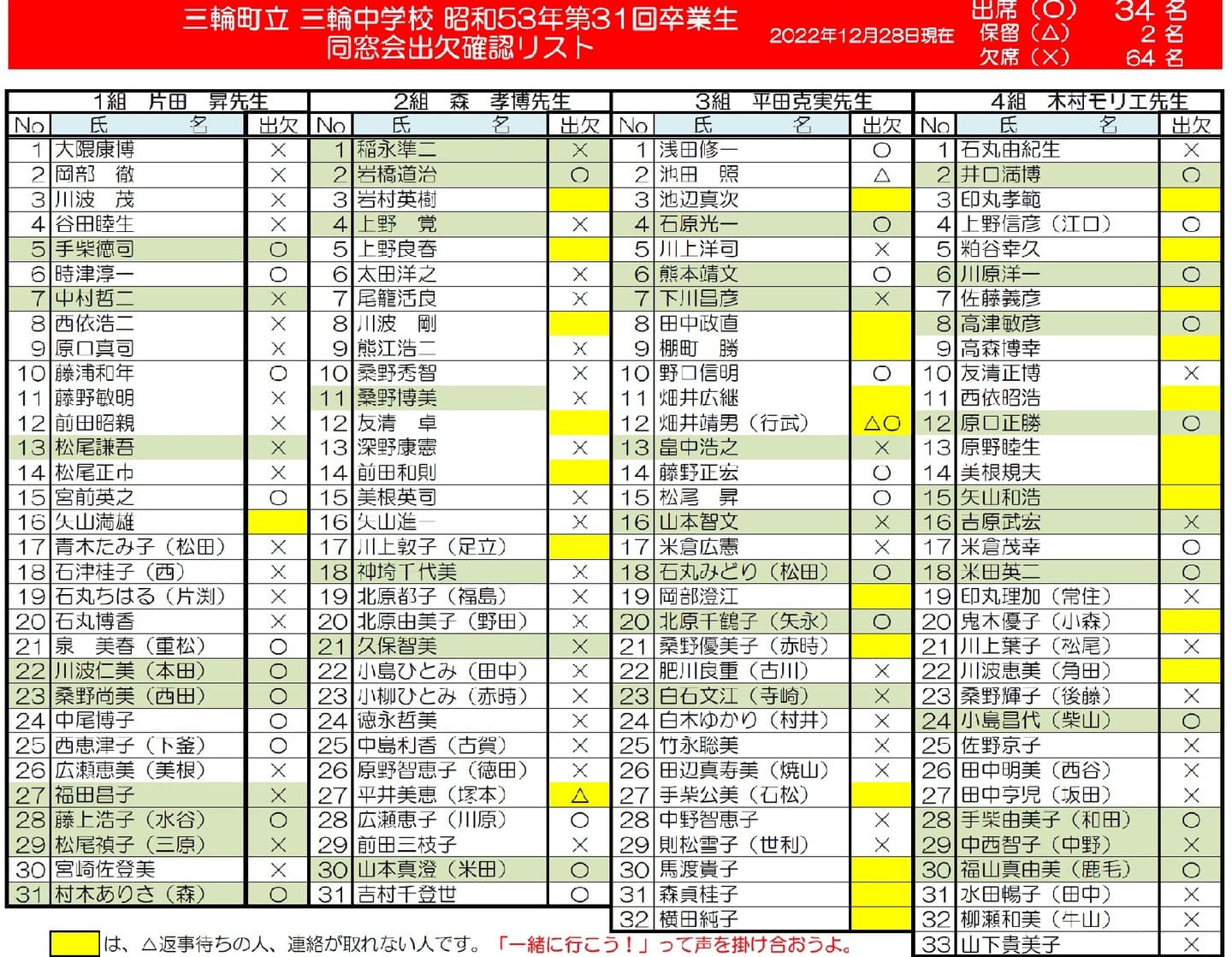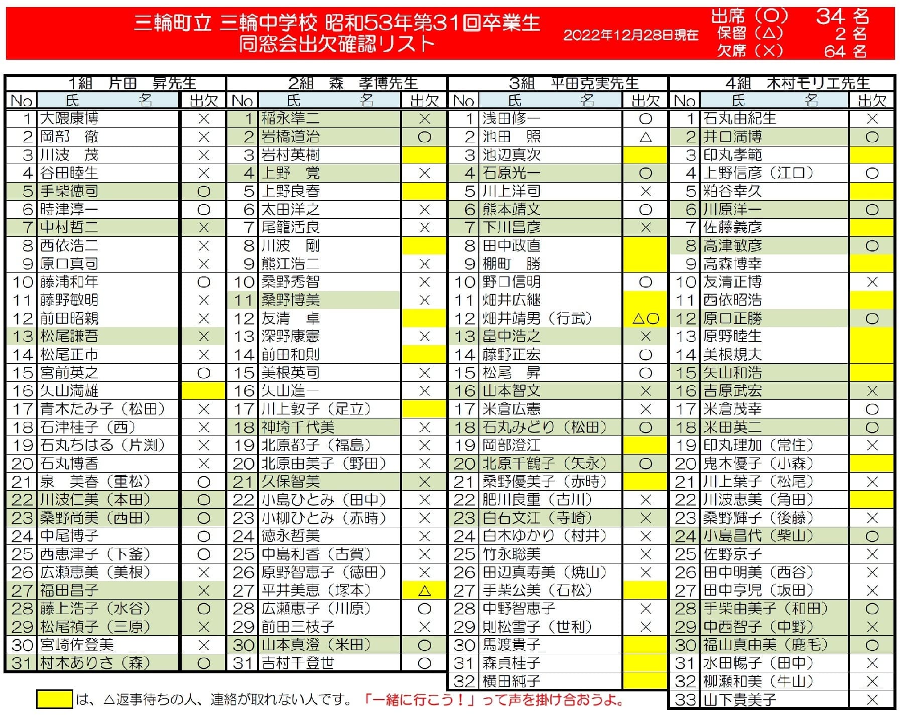 - みんなで声を掛け合いましょうよ。「一緒に行こう」って。 出欠確認表